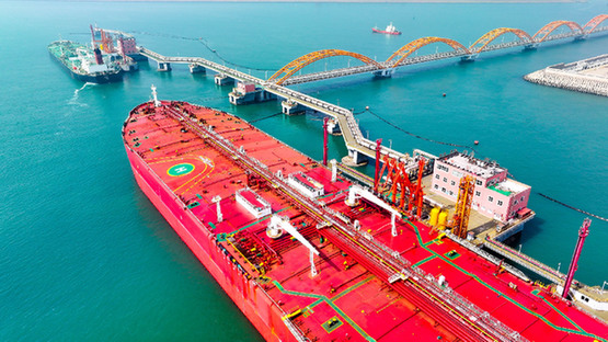 圖為在山東港口日照港嵐山港區(qū)30萬(wàn)噸級(jí)油品碼頭,船舶??窟M(jìn)行卸油作業(yè)(無(wú)人機(jī)照片)?!⌒氯A社記者 郭緒雷 攝