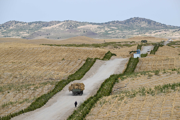 在赤峰市翁牛特旗巴彥呼交嘎查其白線防沙治沙項(xiàng)目區(qū),穿沙公路將沙地切割,沙丘被逐步固定?!∮浾摺∵B振 攝