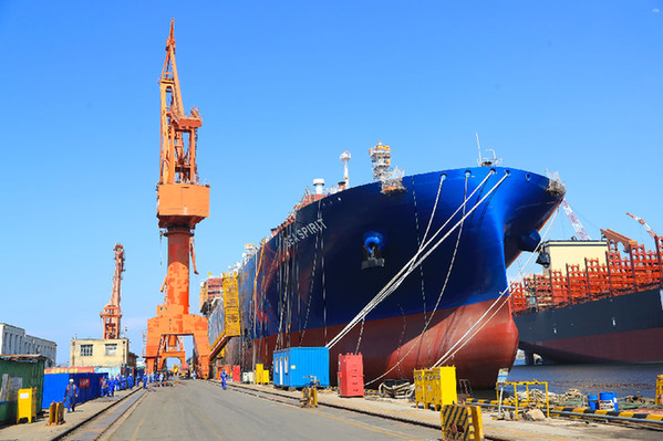 圖為在中國船舶集團(tuán)大連船舶重工集團(tuán)有限公司,正在建造的大型液化天然氣(LNG)運(yùn)輸船?!⌒氯A社記者 楊青 攝