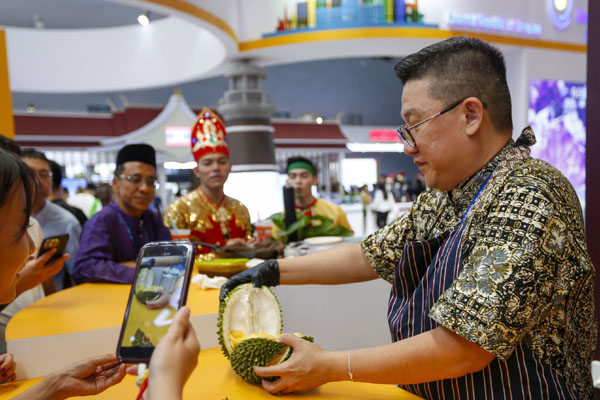 第八屆中國-亞歐博覽會國際展區(qū)云集了琳瑯滿目的各國特色商品,引人駐足。圖左:參觀者在巴基斯坦展臺選購首飾。圖中:馬來西亞展臺工作人員打開榴蓮供參觀者品嘗。圖右:參會嘉賓在吉爾吉斯斯坦展臺洽談。記者 陳朔 攝