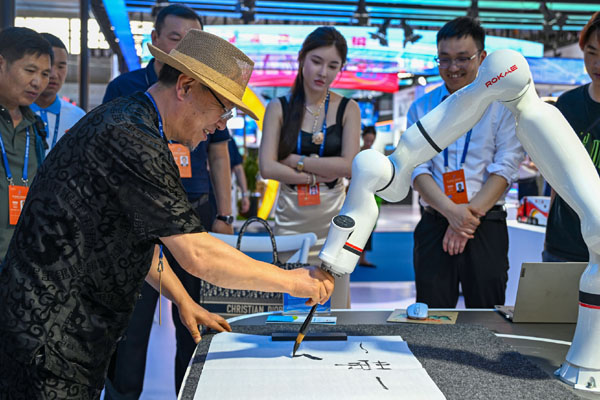 6月26日,在第八屆中國-亞歐博覽會上,參會嘉賓在山東展臺與機器人互動。記者 陳朔 攝