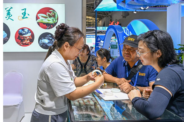 6月30日,在第八屆中國-亞歐博覽會上,觀眾在選購和田玉。記者 陳朔 攝