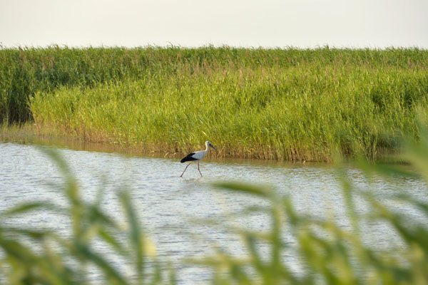 6月25日在山東東營(yíng)拍攝的黃河三角洲國(guó)家級(jí)自然保護(hù)區(qū)的東方白鸛。記者 劉力航 攝