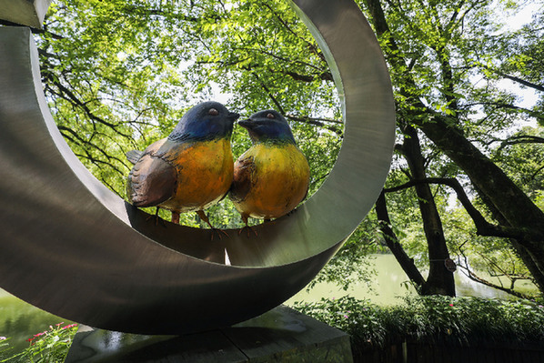 7月3日,在石門(mén)村拍攝的藍(lán)冠噪鹛雕塑。 記者 杜瀟逸 攝