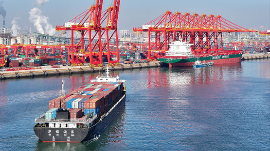 圖為一艘貨輪抵達(dá)山東港口日照港集裝箱碼頭(無(wú)人機(jī)照片)?!⌒氯A社記者 郭緒雷 攝