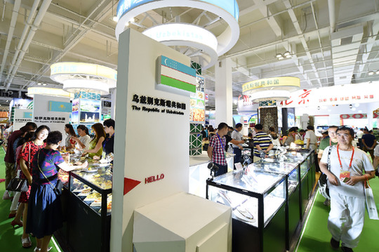 7月8日,在甘肅國(guó)際會(huì)展中心蘭洽會(huì)展館,客商及觀眾在中亞5國(guó)展區(qū)參觀。記者 范培珅 攝