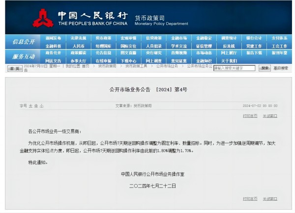 7月22日,央行發(fā)布公開市場業(yè)務公告,宣布即日起公開市場7天期逆回購操作采用固定利率、數(shù)量招標,操作利率由1.8%調(diào)整為1.7%。