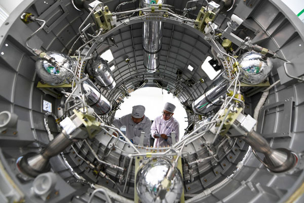 在北京星際榮耀空間科技股份有限公司,裝配測(cè)試人員在安裝液體姿軌控動(dòng)力系統(tǒng)。記者 鞠煥宗 攝