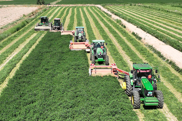 眼下,在巴彥淖爾市磴口縣包爾蓋農(nóng)場有機苜蓿產(chǎn)業(yè)園區(qū)內(nèi),5.8萬畝紫花苜蓿迎風(fēng)搖曳,自走式割草機等大型機械來回穿梭,呈現(xiàn)一派繁忙的收獲景象。該園區(qū)負責(zé)人路建平說,他們通過優(yōu)化品種種植結(jié)構(gòu),大幅提升飼草畝均效益,確保苜蓿營養(yǎng)成分優(yōu)、品質(zhì)好、產(chǎn)量高,平均畝產(chǎn)1000千克左右。