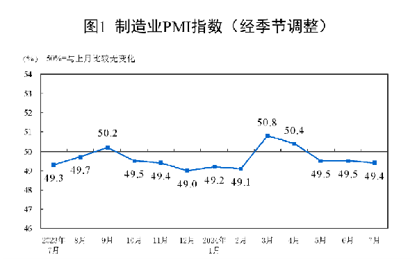 “7月份,因傳統(tǒng)生產(chǎn)淡季、市場需求不足以及局部地區(qū)高溫洪澇災害極端天氣等因素對企業(yè)生產(chǎn)經(jīng)營的影響,制造業(yè)PMI為49.4%,景氣水平略有回落。”國家統(tǒng)計局服務業(yè)調(diào)查中心高級統(tǒng)計師趙慶河說。