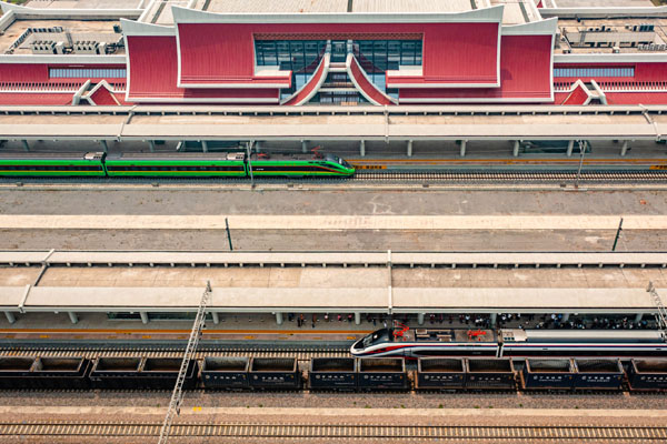 “復(fù)興號(hào)”(上)、“瀾滄號(hào)”動(dòng)車組列車??吭谥欣翔F路磨憨站。(新華社記者 胡超 攝)