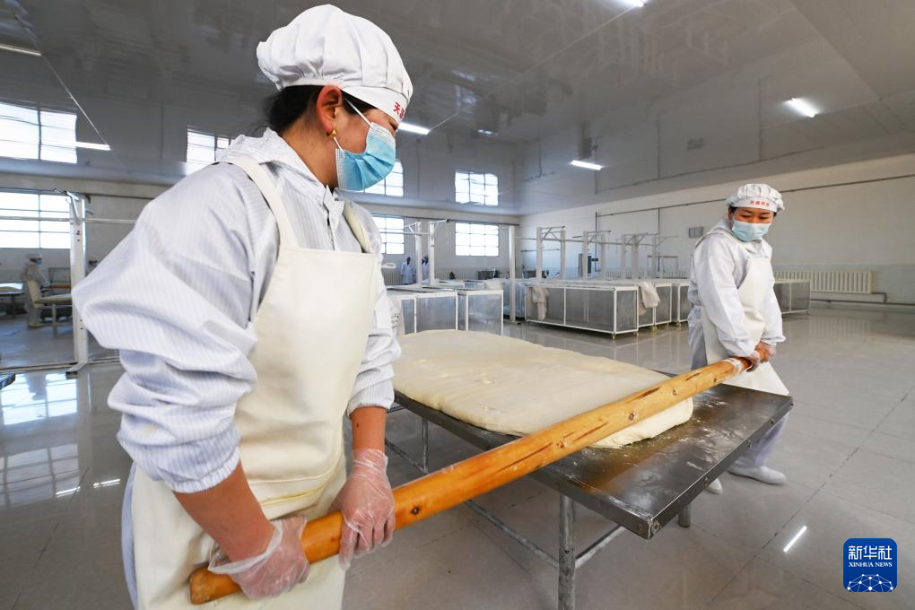 1月16日,在位于古浪縣泗水鎮(zhèn)的一家企業(yè)手工掛面生產(chǎn)車間,工人進(jìn)行壓面操作。