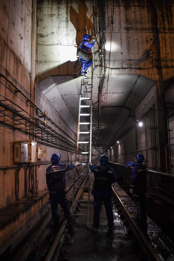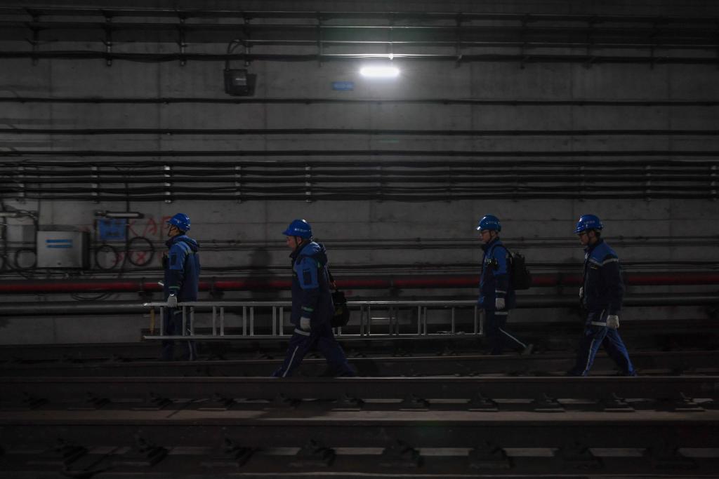 26日凌晨1時5分,在與車控室完成“清車”“停電”兩項工作對接并得到調(diào)度同意后,4人小組每人背著20多斤重的工具包,抬著5米長的梯子,下到地鐵隧道。