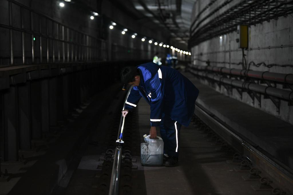 1月26日凌晨,鋼軌“探傷工”在涂抹“耦合劑”。新華社記者 胥冰潔 攝