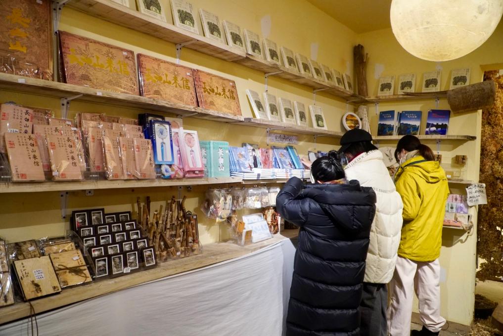 1月26日,幾名顧客在長白山下的文創(chuàng)店中選購產(chǎn)品。新華社記者 孫逸軒 攝