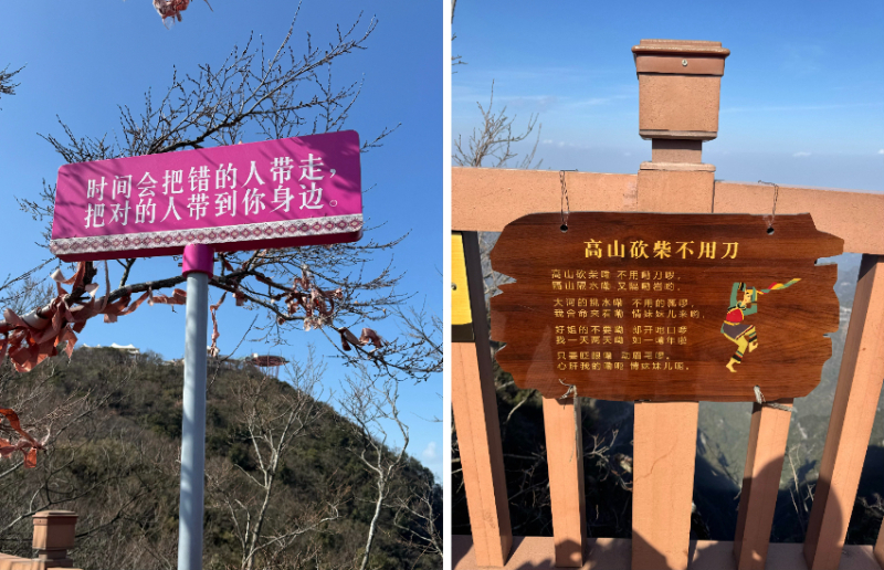 景區(qū)里的標(biāo)語標(biāo)牌,是人為制造“打卡點(diǎn)”的常見手法。張家界景區(qū)里沒有用“我在xxx很想你”之類的套話,而是根據(jù)景點(diǎn)特色用心擬了標(biāo)語,俏皮詼諧又勵(lì)志,就像同行的朋友在給登山者打氣。圍欄上懸掛著民歌、民謠和傳說故事,讓人歇腳的時(shí)候還能念上一段、唱上兩句。道旁植物上也掛著醒目的科普標(biāo)牌,行走在植物資源豐沛的山間,就像走進(jìn)了一座植物博物館。