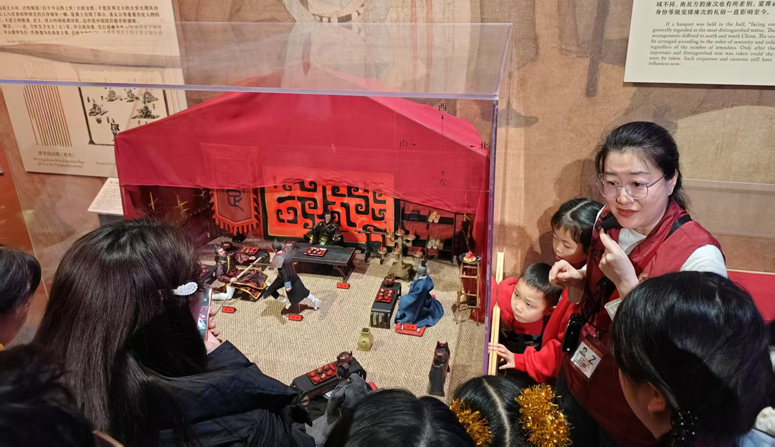 “范增作為項(xiàng)羽的謀臣,座次高于劉邦,這是不正常的?!痹谖挥谡褂[結(jié)尾的鴻門(mén)宴場(chǎng)景復(fù)原展位前,修宇為觀眾詳解其中座次排列相較當(dāng)時(shí)禮制的異常之處,如何體現(xiàn)參加宴會(huì)雙方微妙的心理狀態(tài)。伴隨對(duì)種種細(xì)節(jié)的分析,展臺(tái)上的人物更顯栩栩如生,觀眾仿佛置身其中,從宴會(huì)禮儀的獨(dú)特角度再次品讀了家喻戶(hù)曉的鴻門(mén)宴故事。