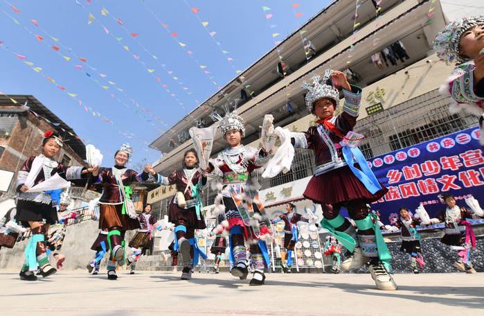2025年3月25日,廣西柳州市融水苗族自治縣桿洞鄉(xiāng)中心小學(xué)學(xué)生在跳蘆笙踩堂舞。新華社記者 黃孝邦 攝