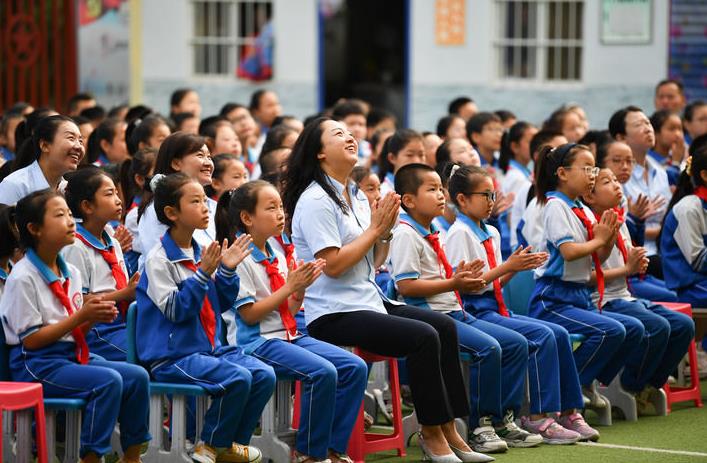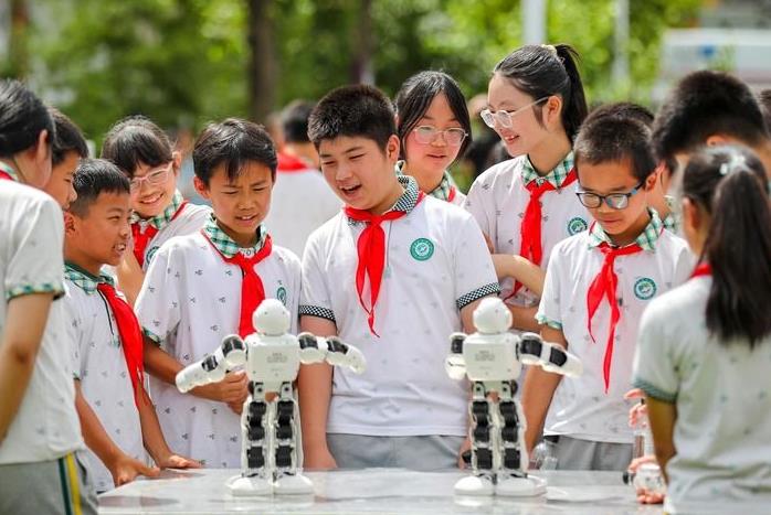 2024年5月30日,四川省宜賓市長(zhǎng)寧縣希望小學(xué)的學(xué)生們?cè)谟傲弧被顒?dòng)上觀看機(jī)器人舞蹈表演。新華社發(fā)(莊歌爾 攝)