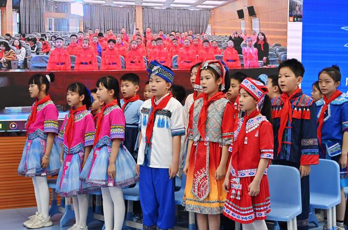 2025年3月28日,在“壯蒙一家親 共筑中國(guó)夢(mèng)”手拉手主題云隊(duì)會(huì)上,廣西南寧市濱湖路小學(xué)四(1)中隊(duì)隊(duì)員通過(guò)網(wǎng)絡(luò)和內(nèi)蒙古鄂爾多斯東勝區(qū)第十二小學(xué)四(9)中隊(duì)隊(duì)員一起唱《中國(guó)少年先鋒隊(duì)隊(duì)歌》。新華社記者 周華 攝