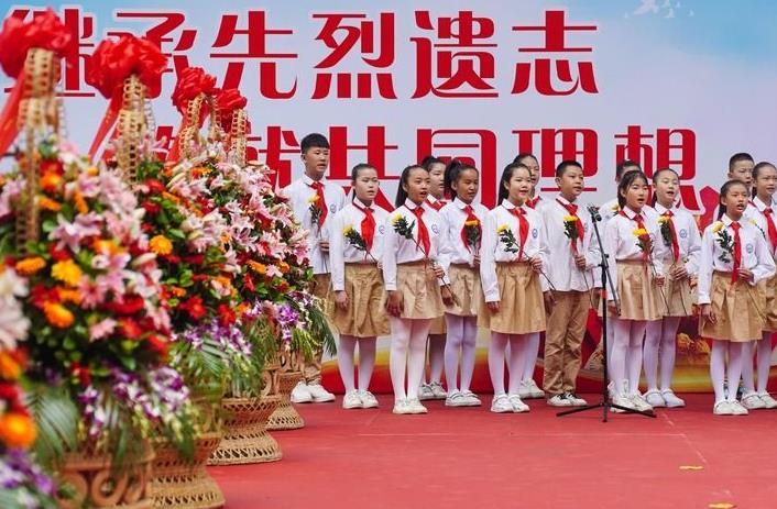 2024年9月30日,四川省眉山市彭山區(qū)向英雄烈士敬獻(xiàn)花籃儀式在彭山區(qū)烈士陵園舉行,少先隊(duì)員在儀式上合唱《我們是共產(chǎn)主義接班人》。新華社發(fā)(翁光建 攝)