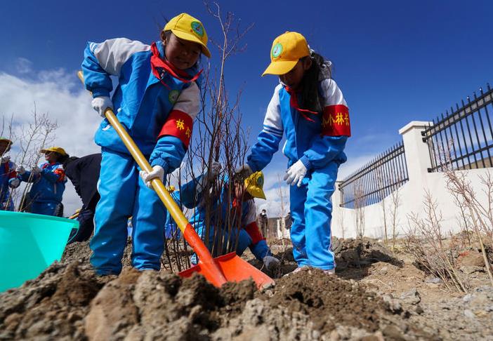 2025年4月25日,西藏那曲市小學(xué)生在植樹(shù)。新華社記者 晉美多吉 攝