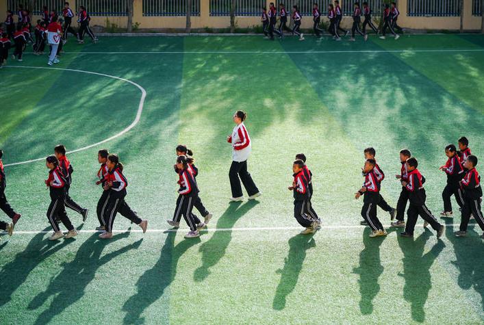 2025年4月24日,在新疆克州阿圖什市哈拉峻鄉(xiāng)謝依特小學(xué),支教教師帶領(lǐng)學(xué)生晨跑。新華社記者 徐宏巖 攝