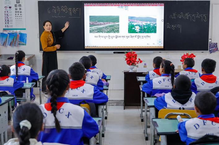 2024年9月27日,在四川省甘孜藏族自治州道孚縣城關(guān)第一完全小學(xué),采取“藏加模式”教學(xué)的五年級(jí)一班的藏語(yǔ)文課上,準(zhǔn)木周老師指導(dǎo)藏族學(xué)生以家鄉(xiāng)草原風(fēng)物為主題寫(xiě)作藏語(yǔ)文作文。新華社記者 沈伯韓 攝