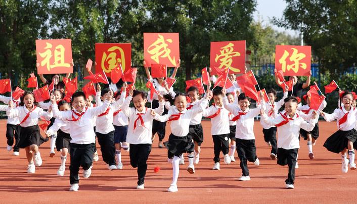 2024年9月29日,山東省臨沂市郯城縣第一實(shí)驗(yàn)小學(xué)學(xué)生手持國(guó)旗快樂(lè)奔跑,喜迎國(guó)慶節(jié)。新華社發(fā)(張春雷 攝)