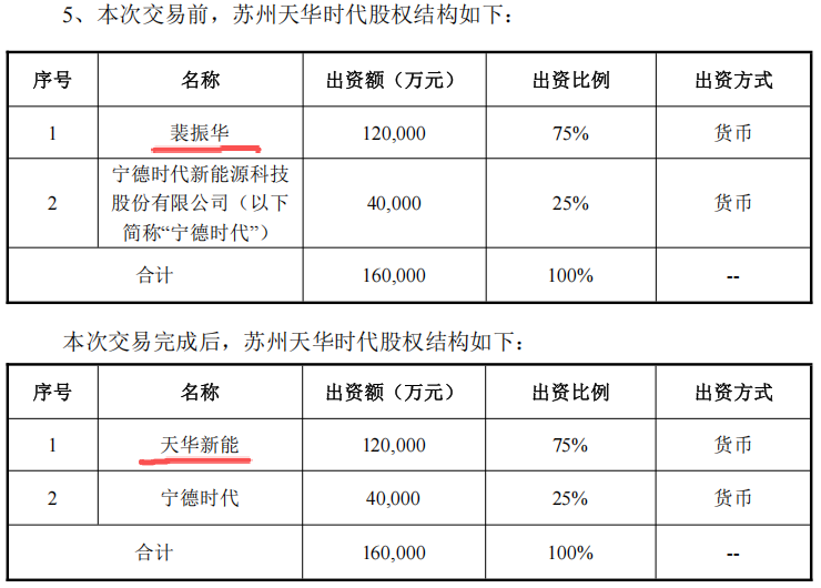 值得一提的是,寧德時(shí)代(300750.SZ)是天華新能的核心客戶,也是公司前十大股東,持股比例為0.59%。而標(biāo)的公司蘇州天華時(shí)代的股權(quán)結(jié)構(gòu)顯示,裴振華持有其75%股權(quán),另外25%股權(quán)為寧德時(shí)代持有。