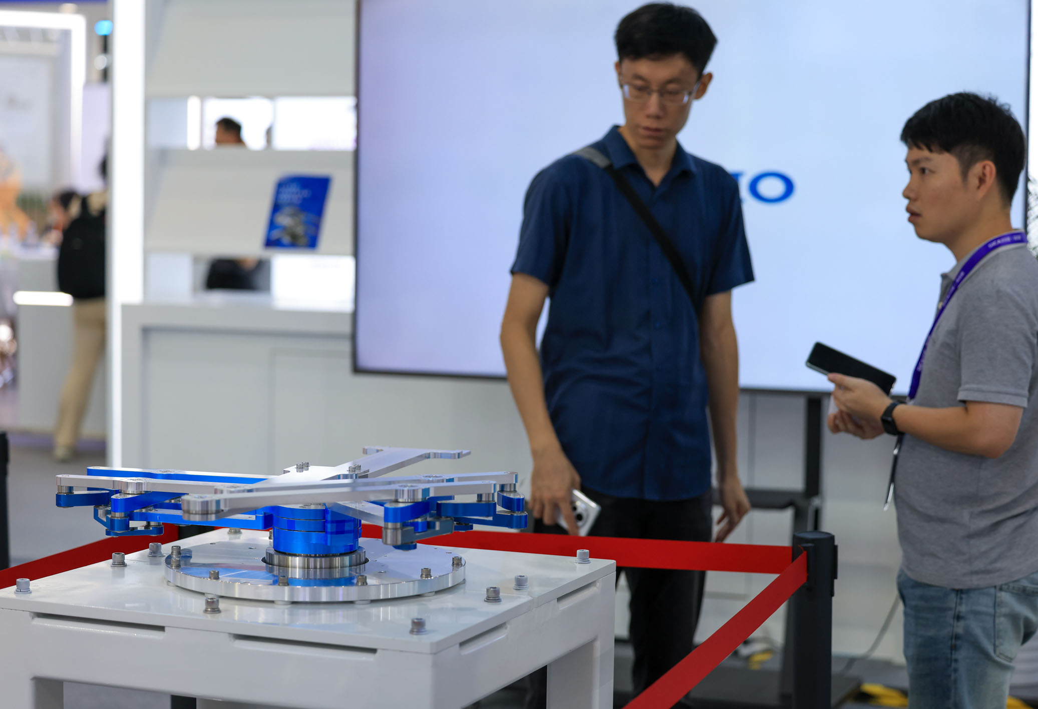 在2025灣區(qū)半導(dǎo)體產(chǎn)業(yè)生態(tài)博覽會(灣芯展)上,參觀者了解一臺晶圓搬運(yùn)機(jī)器人。新華社記者 毛思倩 攝