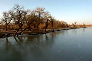 大片的胡楊林得到了黑河水的滋養(yǎng)(攝于3月13日)。近年來,內(nèi)蒙古額濟納綠洲生態(tài)環(huán)境明顯好轉(zhuǎn)。黑河水的抵達使沿河30多萬畝瀕臨死亡的胡楊、檉柳得到了灌溉,這對阻擋沙漠推移,減少沙塵暴發(fā)生頻率和強度起到了積極作用。新華社記者