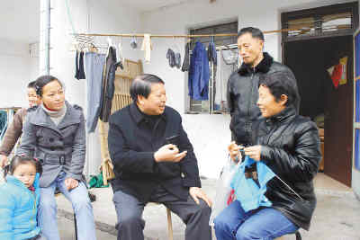 全國人大代表、浙江省奉化市滕頭村黨支部書記傅企平(中)在農民家里調研。袁坤