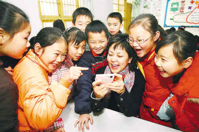 2月28日上午,即將赴京開會的全國人大代表吳新春(中)在四川省遂寧市船山區(qū)農民工子弟學!鞂m廟小學看望孩子們,了解學校義務教育情況。鐘敏