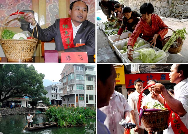 上左圖:3月12日,陳飛在中國政法大學(xué)講述“菜籃子的故事”。 上右圖:浙江省永嘉縣渠口鄉(xiāng)珠岸村村民提著菜籃子買菜(2007年4月13日攝)。 下左圖:山水環(huán)繞的浙江省永嘉縣渠口鄉(xiāng)珠岸村(資料照片)。 下右圖:陳飛提著菜籃子在街頭宣傳環(huán)保(資料照片)。 新華社記者