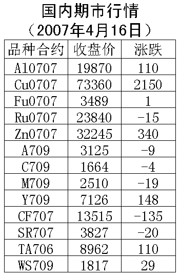 4月16日國(guó)內(nèi)期貨市場(chǎng)金屬價(jià)格上漲。倫敦銅上周五上漲72.5美元/噸,收盤7732.5美元/噸。滬銅707合約周一上漲2150元/噸,收盤73360元/噸。東京橡膠周一上漲4.3日元/公斤,收盤297.2日元/公斤。滬膠707合約周一下跌15元/噸,收盤23840元/噸,支撐價(jià)位23000元一線,上漲壓力24000元一線。美原油上周五下跌0.22美元/桶,收盤63.57美元/桶。滬燃油707合約周一上漲1元/噸,收盤3489元/噸,支撐價(jià)位3400元一線,上漲壓力3600元一線。