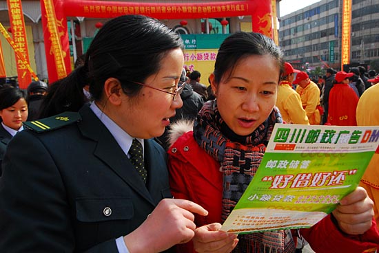 | 1月31日,中國郵政儲蓄銀行江油市支行工作人員(左)正在向一名當(dāng)?shù)貍體工商戶陳女士介紹小額貸款業(yè)務(wù)。 當(dāng)日,中國郵政儲蓄銀行四川省分行正式啟動小額貸款業(yè)務(wù)試點。這是繼郵政儲蓄存單質(zhì)押貸款之后,中國郵政儲蓄為廣大小企業(yè)主和農(nóng)戶開辟的一個新的貸款渠道,有望2008年在四川全省推廣。