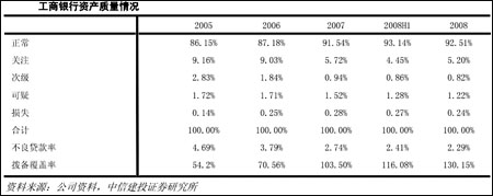 工行2008年不良貸款繼續(xù)雙降,年末不良貸款余額1044.82億元,較2008年初下降了72.92億元,不良貸款率較年初下降0.46%個百分點,撥備覆蓋率(不計稅后利潤中計提的一般準備)達到130.15%,工行的信貸資產(chǎn)配置比較穩(wěn)健,基礎設施、公用事業(yè)等低風險政府背景項目貸款比重較高,預計其資產(chǎn)質(zhì)量在2009年和2010年有望保持穩(wěn)定。