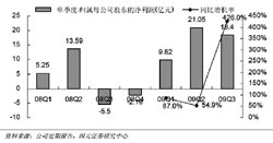 單季度歸屬于母公司的凈利潤(rùn)變化及同比增速(2008.Q1-2009.Q3) |