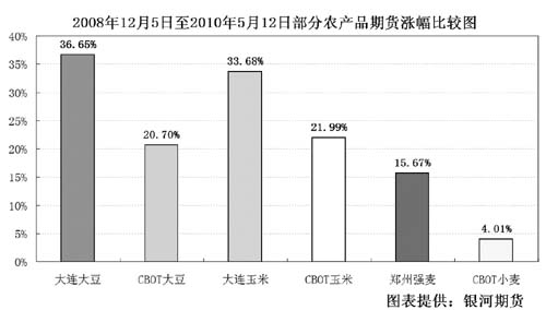 隨著金融危機(jī)對(duì)商品的利空逐漸消化,農(nóng)產(chǎn)品期貨價(jià)格自2008年12月初以來,走出了震蕩回升的行情;國(guó)內(nèi)由于受到國(guó)家收儲(chǔ)政策的提振,總體漲幅要大于國(guó)際市場(chǎng)。 其中,2008/09年南美大豆大幅減產(chǎn)與中國(guó)大豆收儲(chǔ)政策奠定了大豆期貨價(jià)格上漲的基調(diào);而國(guó)內(nèi)玉米與小麥上漲則主要是受到政策托市的支撐,CBOT玉米與小麥價(jià)格主要受商品整體上漲帶動(dòng),但國(guó)際小麥供應(yīng)一直較為充足,價(jià)格漲幅明顯低于其他品種。
