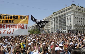 希臘兩大工會5月20日再次發(fā)起大罷工,這是今年希臘的第四次全國大罷工。繼續(xù)抗議政府增稅、削減工資和退休金的緊縮政策。希臘的危機并沒有過去。新華社發(fā) |