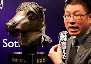 | 馬首銅像將于10月4日至8日在香港蘇富比秋季拍賣預(yù)展中展出。 | 香港蘇富比近日宣布,全國政協(xié)常委何鴻燊已以6190萬港元的價格,購入原圓明園海晏堂御制12生肖“水力鐘”噴泉的馬首銅像,并決定將其捐贈給國家。 據(jù)香港蘇富比提供的消息,此件文物原定于今年10月通過香港蘇富比拍賣,但因何鴻燊有意將馬首銅像捐贈國家,原收藏者遂同意拍賣前將銅像售予何鴻燊。 何鴻燊購下文物后表示,很榮幸能參與搶救流失海外文物的工作,繼豬首銅像之后,將馬首銅像捐贈國家。他希望能借此帶動更多的人參與保護(hù)中國文物的工作。 據(jù)悉,馬首銅像將于10月4日至8日在香港蘇富比秋季拍賣預(yù)展中展出,并從10月9日起在澳門葡京酒店展出。 圓明園海晏堂御制馬首銅像,是清朝乾隆年間修建在圓明園的12生肖報時噴泉(俗稱“水力鐘”)邊的飾物。12生肖動物銅像人身獸首,以盤坐之態(tài)作雙半月形分列噴泉之左右,各自按其代表的12時辰,依次輪流報時,馬首銅像本為噴泉左邊列第三的生肖銅像。 1860年英法聯(lián)軍攻入北京城,報時噴泉慘遭破壞,生肖頭像流失海外。2003年,中國保利藝術(shù)博物館用3317萬港元,從香港佳士得和蘇富比兩家拍賣行購得銅牛首、猴首和虎首三件圓明園文物。 目前圓明園獸面人身的12生肖銅像中,豬首、牛首、猴首和虎首四件已回歸祖國,其中的豬首銅像也是由何鴻燊購回并捐贈國家。目前,已知銅鼠首、兔首由法國人收藏;銅龍首、蛇首、雞首、狗首、羊首下落不明。