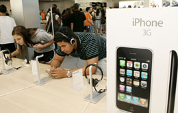 日前,3G版iPhone手機(jī)在全球22個(gè)國家和地區(qū)上市,引發(fā)蘋果迷們的購買熱潮。圖為在美國紐約的一家蘋果專賣店,顧客在體驗(yàn)3G版iPhone手機(jī)。新華社記者:侯俊