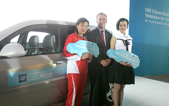 通用汽車中國公司總裁兼總經(jīng)理甘文維(中)授予奧運(yùn)會跳水冠軍吳敏霞(左)及影視明星劉孜“通用汽車清潔能源汽車大使”稱號。