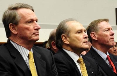 11月19日,美國通用汽車公司董事會主席、首席執(zhí)行官喬治·理查德·瓦戈納(左一)、克萊斯勒汽車公司首席執(zhí)行官羅伯特·納爾代利和福特汽車公司首席執(zhí)行官艾倫·穆拉利(右一)在華盛頓國會山出席眾議院金融委員會就美國汽車工業(yè)救援方案舉行的聽證會。本報記者:張巖