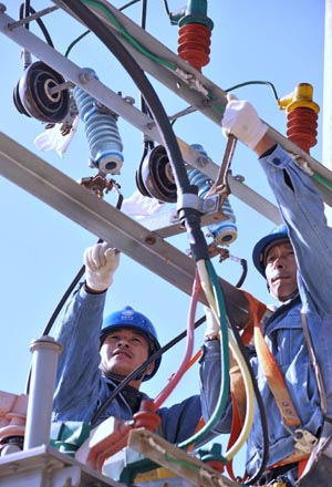 2007年以來,福建省武夷山市供電公司加快實施農(nóng)村電氣化建設(shè),無償提供近千萬元資金進行線路整改、專用線架設(shè)、新建變電站等電網(wǎng)建設(shè),改變了過去農(nóng)村用電難、用電貴的局面。圖為電力工人在福建省武夷山市星村鎮(zhèn)黃村村架設(shè)電網(wǎng)。