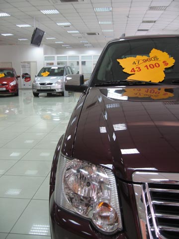 2008年哈薩克斯坦進口新車銷量比2007年暴跌30%,各大代理商紛紛降價銷售庫存車輛。 圖為1月21日,哈薩克斯坦第二大進口汽車官方代理商“M-Auto”的銷售展廳內(nèi),福特EXPLORER越野車降價銷售。