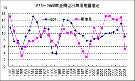 電力工業(yè)是國民經(jīng)濟(jì)的基礎(chǔ)產(chǎn)業(yè),為國民經(jīng)濟(jì)的發(fā)展提供動力支持。通過分析1978年以來國民經(jīng)濟(jì)、電力消費(fèi)、發(fā)電裝機(jī)等增長情況,不難發(fā)現(xiàn),經(jīng)濟(jì)周期與電力消費(fèi)增長、發(fā)電裝機(jī)增長以及電力供需形勢的關(guān)系還是有規(guī)律可循的。 電力消費(fèi)與經(jīng)濟(jì)發(fā)展密切相關(guān)。1978年以來全國用電量增速與經(jīng)濟(jì)增速變化如圖所示。經(jīng)濟(jì)學(xué)告訴我們,經(jīng)濟(jì)發(fā)展具有一定的周期性。1978年以來,我國國民經(jīng)濟(jì)增長明顯存在三個周期,分別是1981年至1989年、1990年至1998年及1999年以來。受國際金融危機(jī)等因素的影響,2008年我國經(jīng)濟(jì)快速進(jìn)入了下降通道。 由于經(jīng)濟(jì)發(fā)展的周期性特點(diǎn),電力消費(fèi)增長也具有周期性,并且電力消費(fèi)增長周期與經(jīng)濟(jì)發(fā)展周期基本同步。盡管兩者存在相同的周期,但在不同的經(jīng)濟(jì)發(fā)展階段,兩者的變化特點(diǎn)是不一樣的。比如,1995年至1998年經(jīng)濟(jì)屬下行階段,經(jīng)濟(jì)增速下降了3.1個百分點(diǎn),全社會用電量增速下降了6.5個百分點(diǎn),用電量增速下降幅度比經(jīng)濟(jì)增速下降幅度高出3.4個百分點(diǎn);1999年至2007年是經(jīng)濟(jì)上行階段,經(jīng)濟(jì)增速提高了5.4個百分點(diǎn),而用電量增速提高了8.2個百分點(diǎn),用電量增速上升幅度比經(jīng)濟(jì)增速高2.8個百分點(diǎn);2008年,受國際金融危機(jī)以及我國經(jīng)濟(jì)周期下行等因素影響,經(jīng)濟(jì)增速下降了4個百分點(diǎn),而全社會用電量增速下降了9.6個百分點(diǎn),用電量增速下降幅度比經(jīng)濟(jì)增速高5.6個百分點(diǎn)。 由此可見,電力消費(fèi)增速作為反映經(jīng)濟(jì)增長的先行指標(biāo),在近十幾年的波動幅度要大于經(jīng)濟(jì)增速的波動幅度。當(dāng)經(jīng)濟(jì)增速回落時,用電增速出現(xiàn)明顯回落;當(dāng)經(jīng)濟(jì)增速上升時,用電增速也出現(xiàn)明顯上升。 長期以來,我國的電源建設(shè)項(xiàng)目均需要國家有關(guān)部門審批或核準(zhǔn)。在經(jīng)濟(jì)下行階段,國家會相應(yīng)減少電源項(xiàng)目的開工建設(shè)規(guī)模;但在經(jīng)濟(jì)上行階段,由于缺少對經(jīng)濟(jì)運(yùn)行周期的預(yù)先準(zhǔn)確判斷,往往是在經(jīng)濟(jì)開始處于上升階段時才大量增加電源新開工項(xiàng)目;由于電源建設(shè)工期較長,從而導(dǎo)致發(fā)電裝機(jī)增速滯后于經(jīng)濟(jì)增速變化,電力供需緊張,進(jìn)而影響到經(jīng)濟(jì)發(fā)展。例如2000年以來,我國經(jīng)濟(jì)開始進(jìn)入新一輪增長周期,但發(fā)電裝機(jī)增速持續(xù)下降,到2002年僅增長5%左右,遠(yuǎn)低于GDP增速和用電量增速,從而導(dǎo)致2003至2005年出現(xiàn)了全國性電力供應(yīng)緊張局面。