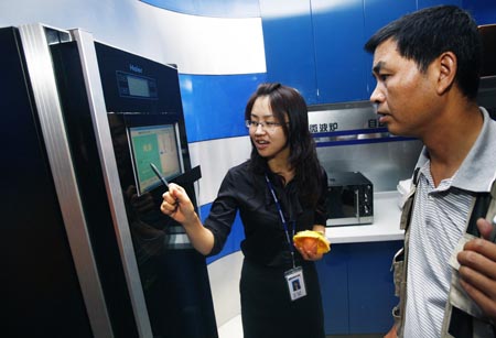 工作人員正在向觀眾介紹一款智能冰箱,這款冰箱可以自動顯示“肚子”里食物的種類和數(shù)量。