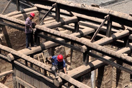 6月29日,工人們在明清古民居群異地遷建工地施工。 近日,河南省焦作市文物局開始對南水北調(diào)中線工程焦作市區(qū)段地上文物西王褚村明清民居建筑群進(jìn)行整體異地遷建。西王褚村明清民居建筑群是研究焦作地區(qū)明清民居的建筑手法及明末清初焦作工商業(yè)發(fā)展的實物依據(jù)。